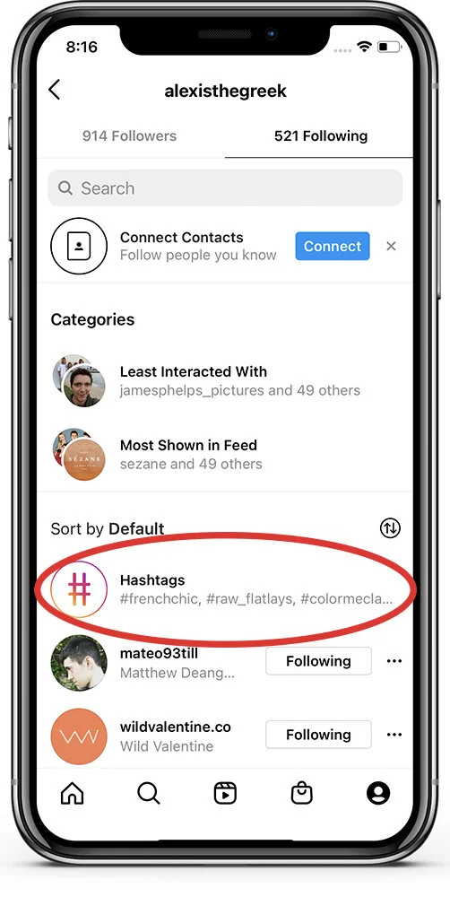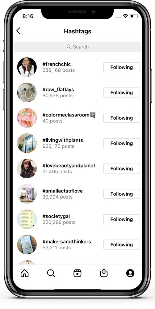 Step 4: To keep track of tags you’re following, tap to your own profile (indicated by the face icon in the bottom right of the app), and tap “Following” at the top of the screen, not to be confused with “Followers.”